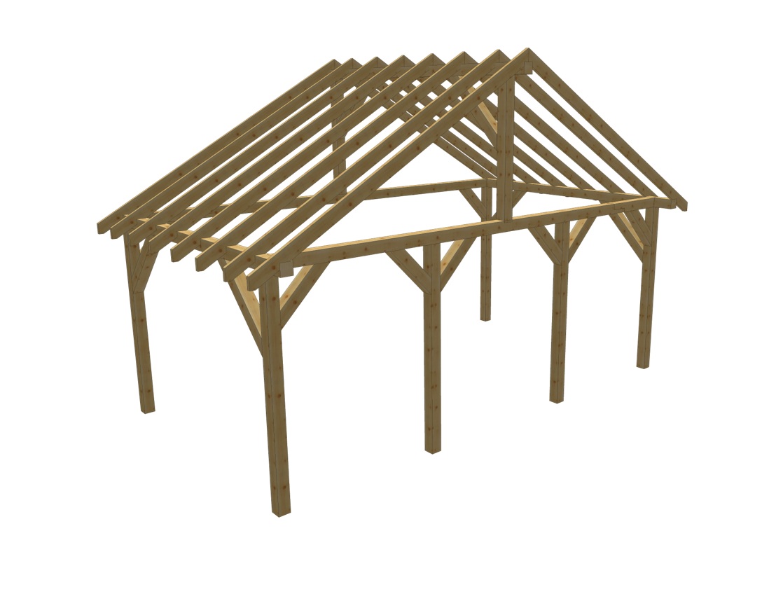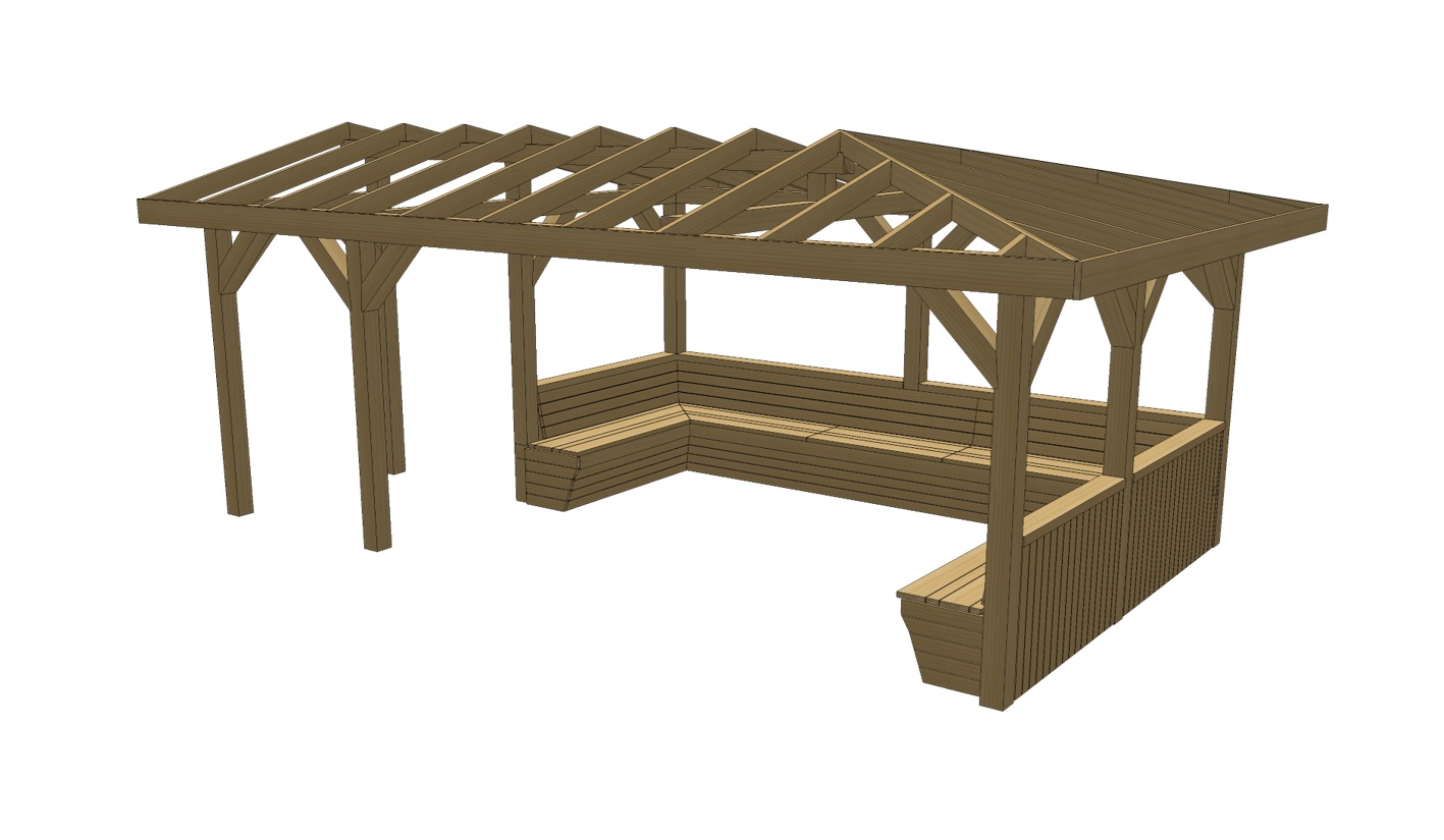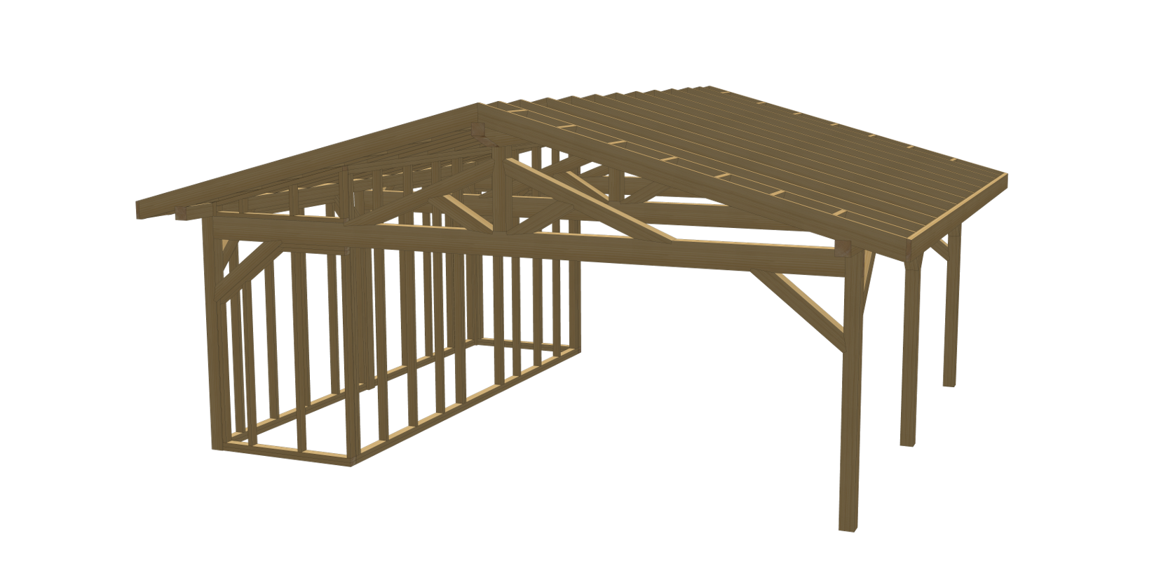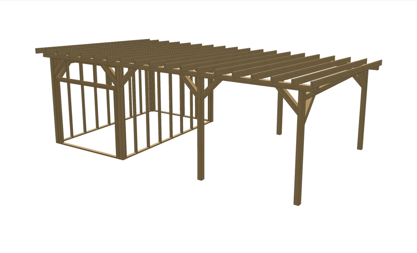 Praktyczna konstrukcja łącząca przestronną wiatę z wydzielonym pomieszczeniem gospodarczym to idealne rozwiązanie dla osób, które chcą maksymalnie wykorzystać przestrzeń przy domu. Z jednej strony komfortowe zadaszenie na samochody, sprzęt lub strefę roboczą. Z drugiej zamknięte pomieszczenie, które sprawdzi się jako schowek, warsztat, magazyn ogrodowy czy miejsce na rowery. Dwuspadowy dach o nachyleniu 15° nadaje konstrukcji klasyczny, solidny wygląd i zapewnia skuteczne odprowadzanie wody oraz śniegu. Wysoka kalenica (378 cm) sprawia, że całość prezentuje się masywnie i proporcjonalnie, a jednocześnie daje dużą swobodę aranżacyjną wewnątrz.To rozwiązanie dla osób, które cenią praktyczność, trwałośći estetykę w jednym projekcie.